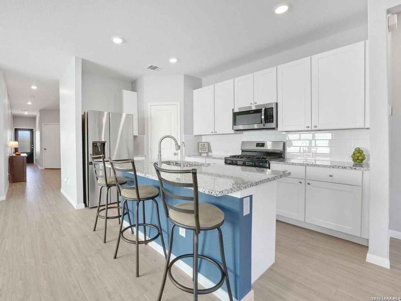 Located in Silos, where the resort-style recreation center and year-round events foster connection and community. High ceilings and luxury vinyl plank flooring flow throughout. White cabinetry, and solid counters in baths and kitchen plus gas cooking, and stainless appliances. Air and water quality upgrades plus security features enhance comfort and peace of mind. Refrigerator, washer, & dryer convey. The home has three generously sized bedrooms plus a dedicated office with double doors located off the central foyer. The home has a spacious, open floor plan with the kitchen located at the heart of the home, with the kitchen sink anchored in a large breakfast bar looking out to the great room dining and living spaces. Nestled at the back of the home, the private primary suite offers peaceful views of the backyard and a spa-style bath with extended dual vanity, private water closet, oversized tiled walk-in shower, and a 9x15 walk-in closet. The secondary bathroom includes solid surface counters, white cabinets and tub/shower with ceramic tile surround. Designed with comfort and well-being in mind, the home includes a smart thermostat for energy efficiency, exterior security cameras, smart entry lock, Ring doorbell camera, RainSoft water softener with reverse osmosis, whole-house air purification system, laundry oxygenation system, and a tankless gas water heater-enhancing air quality, water quality, and efficiency from day one. Residents of Silos enjoy the Farmhouse amenity center, with a resort-style pool, partially-covered playground, 24-hour fitness center, and gathering spaces that host year-round events and social activities coordinated by on-site community managers-creating opportunities to connect, stay active, and enjoy a vibrant neighborhood lifestyle. Dont wait ~ Schedule your private tour today. ~ Qualified buyers may have access to special conventional financing options that can help reduce upfront costs. Buyer to verify with lender. ~ VA Loan Assumption may be an option for VA eligible Buyers.