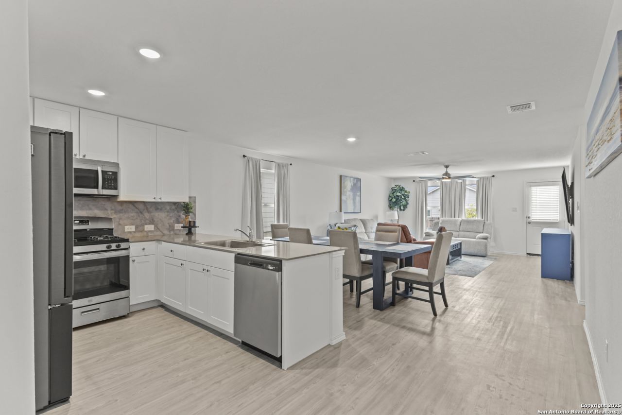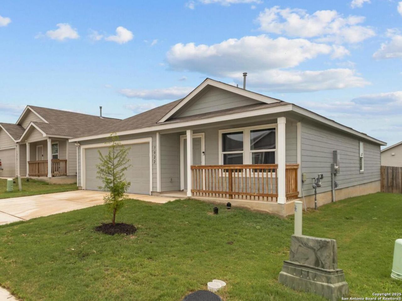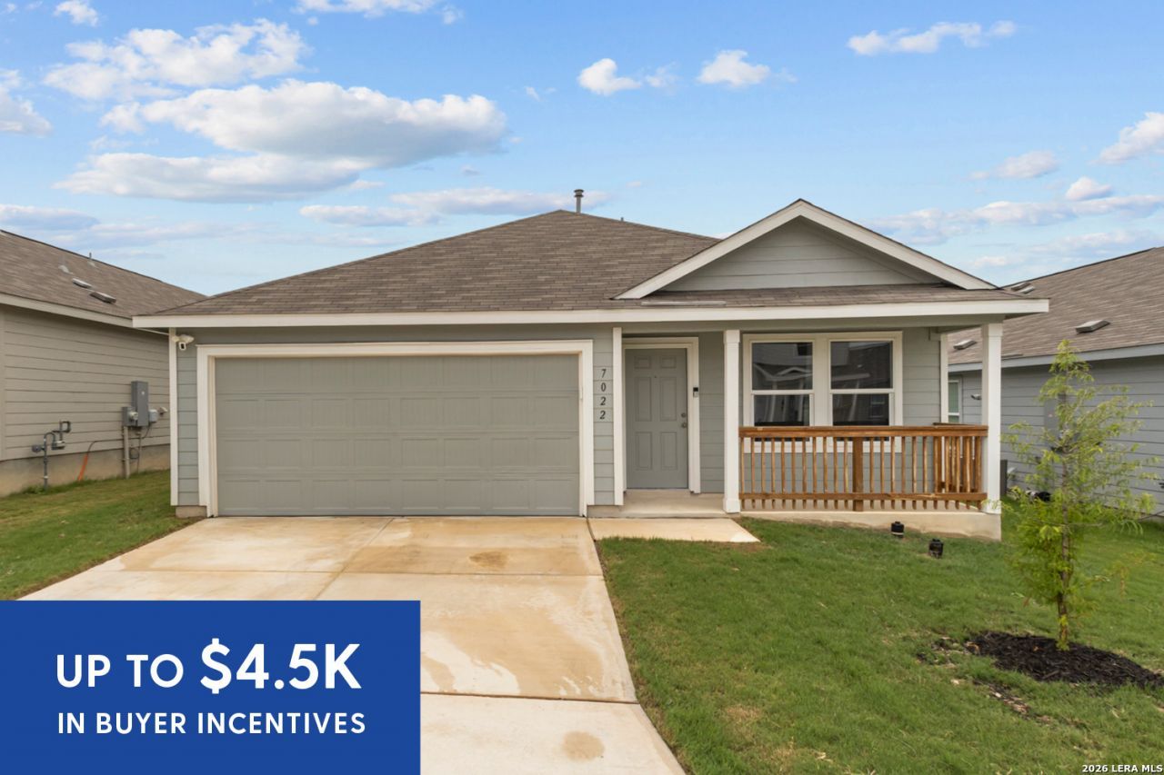 Welcome to 7022 Serf Place. A beautifully designed 3-bedroom, 2-bathroom single-story home located in the vibrant Silos community on San Antonios rapidly growing west side. Built by Lennar, this 1,498 sq ft residence combines modern comfort with thoughtful layout, perfectly suited for both everyday living and entertaining. As you step onto the covered front porch, youre greeted by a well-balanced floor plan that places two spacious bedrooms near the entrance, ideal for guests, family, or a home office setup. The heart of the home features a bright, open-concept living room and kitchen, where stainless steel appliances, abundant cabinetry, and generous counter space offer the perfect setting for gatherings or quiet dinners at home. Flooded with natural light, the living area flows effortlessly to the private owners suite at the rear, offering a peaceful retreat. The master bedroom includes a spa-inspired en-suite bathroom with a single vanity, separate shower and soaking tub, and ample closet space. Step outside to a backyard with a concrete patio slab, ideal for outdoor dining, grilling, or relaxing under the Texas sky. Located just minutes from Lackland Air Force Base, this property is ideal for military professionals and commuters. Residents enjoy easy access to major highways, retail centers, and local parks, all while being a short drive to downtown San Antonio and its renowned cultural landmarks.
