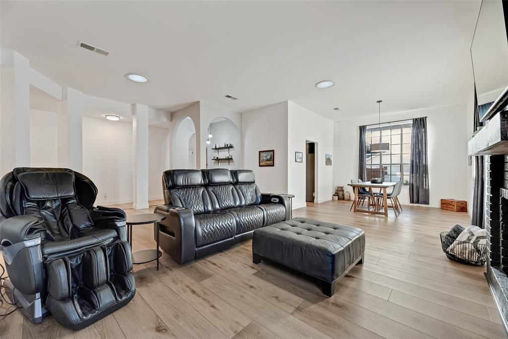 Located just behind Waterchase Golf Course in Bentley Village, this established neighborhood is known for its mature trees, spacious lots, and quiet, tree-lined streets. Throughout the home, you’ll find refreshed interior paint, scraped popcorn ceilings, updated flooring, modern light fixtures, and major system updates, including a new HVAC system replaced in 2023. The upgraded tube skylights bring an abundance of light throughout the house saving on electric bills. Upon entering through the front doors, you are greeted by an expansive formal living room complete with a fireplace, oversized wet bar, and dedicated dining area—ideal for hosting holidays, dinner parties, or casual gatherings. This 4-bedroom, 3-bath home features a split floor plan for added privacy. On one side of the home, the oversized primary suite includes an updated bath with dual vanities and dual closets. The separate vanity areas connect to a spacious, recently updated walk-in shower at the center of the suite. Across the home, you will find three additional bedrooms. Two secondary bedrooms share an updated Jack and Jill bathroom. The fourth bedroom includes sliding glass doors that open to the back patio, creating an ideal space for a home office, fitness room, or additional living area filled with natural light. A separate bonus room offers flexibility for storage or other uses. The backyard is shaded by mature trees and comes alive when in full bloom. Designed for entertaining, it features a built-in barbecue grill and generous patio space. A rear-entry garage with a security gate provides added privacy and convenience. Conveniently located between Fort Worth and Dallas, this home offers an easy commute in either direction. Shopping, dining, and entertainment options are just minutes away, making everyday errands and weekend plans easily accessible.