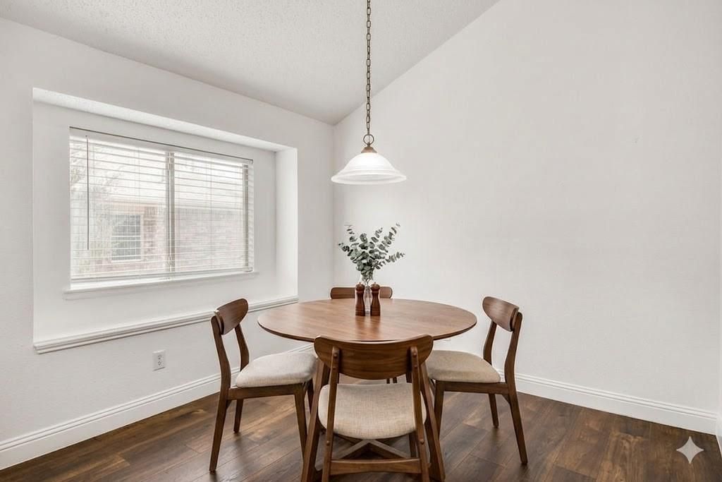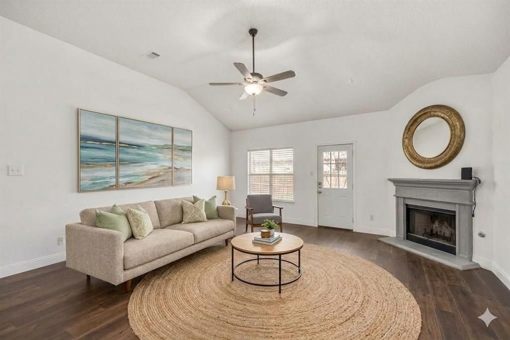 Beautiful 3-bedroom, 2-bath home with a 2-car garage featuring an open floor plan and desirable split-bedroom layout. Bright and inviting with vaulted ceilings, decorative arches, plant ledges, and abundant natural light from large windows. Beautiful LVP flooring runs throughout the home—no carpet. The spacious living room with a cozy fireplace opens to the kitchen, where a large island overlooks the living area—perfect for everyday living and entertaining. The private primary suite includes an ensuite bath with a separate tub and shower. Enjoy the fenced backyard and community amenities including a pool, playground, and sidewalks. Ideally located near major highways, shopping, dining, Starbucks, Kroger, Target, movie theaters, Hobby Lobby, and family entertainment, with convenient access to Fort Worth. Situated in a quiet, friendly neighborhood within Eagle Mountain ISD.