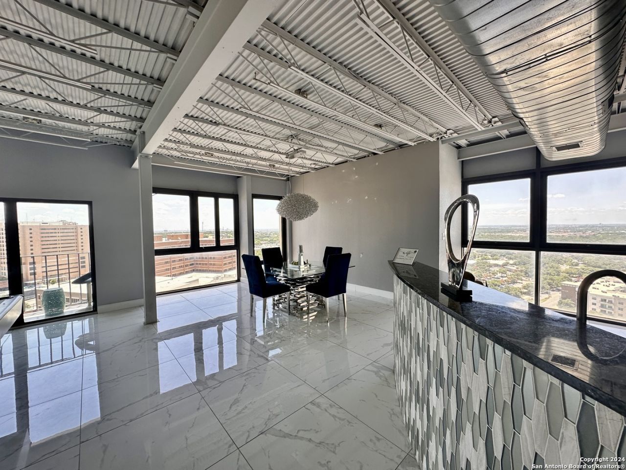 Luxurious 3 bedroom, 2 1/2 bath condo on the 23rd floor in the heart of South Texas Medical Center. This penthouse boasts stunning city views from one of its two balconies. Recently renovated with high-end finishes, including beautiful marble floors, a walk-in shower, custom California Closet, and modern stainless steel appliances. The unit features remote-controlled blinds on its floor-to-ceiling windows and an open floor plan with a contemporary design. An additional room can be used as an office or study
