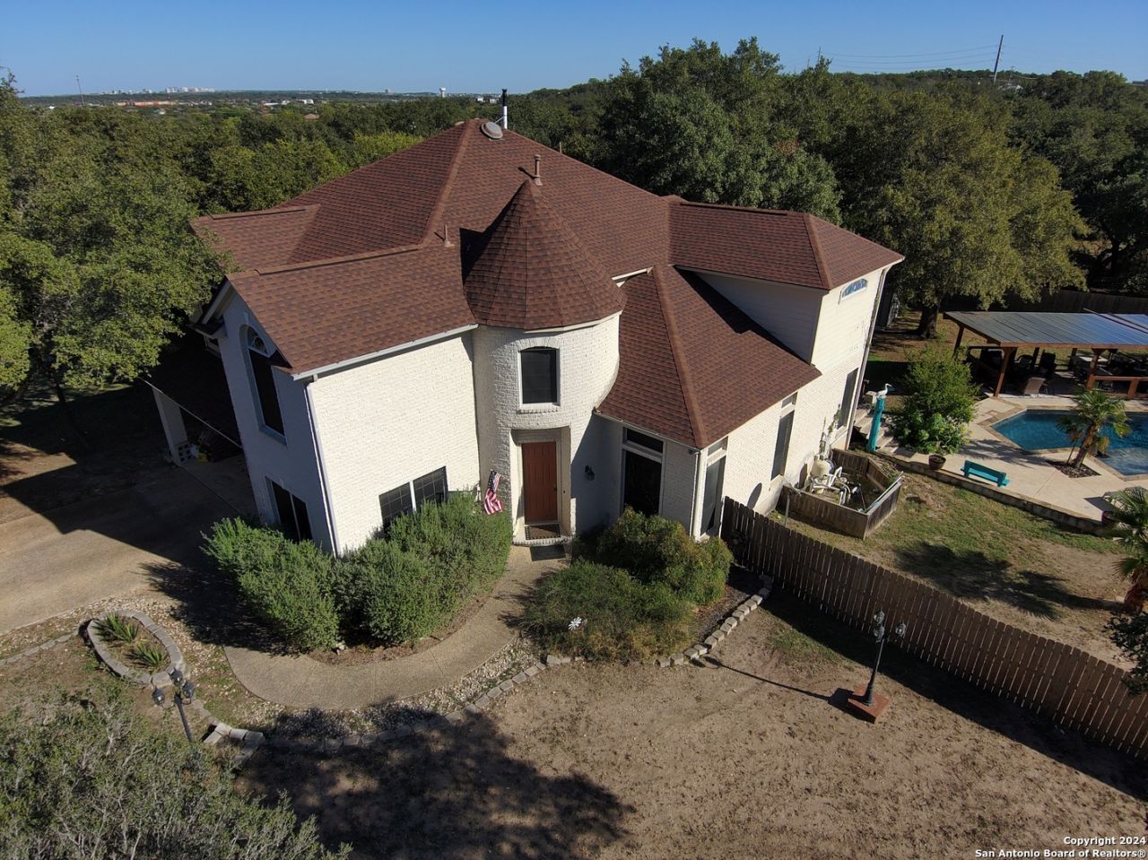 The Estates of Westover Hills presents an exclusive lifestyle with a stunning castle-style home on Barons Creek. Spanning over 3,500 sq ft on a rare .91 acre lot, this meticulously maintained residence features elegant appliances, granite countertops, and multiple living spaces. Enjoy a private deck off the master bedroom, a game room, and an office area, offering both comfort and versatility. The backyard is an entertainers dream, boasting a beautiful swimming pool, a spacious covered patio, an expansive deck, a detached half bathroom, and a cozy fire pit-perfect for gatherings. This property seamlessly blends the tranquility of a country home with close proximity to Sea World, Lackland AFB, and major highways, making it an ideal retreat for holiday hosting and everyday living.